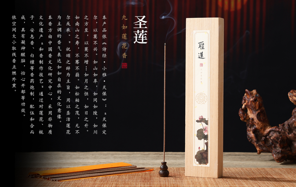 本产品依《诗经·小雅·天保》:“天保定尔,以莫不兴。如山如阜,如冈如陵,如川之方至,以莫不增…如月之恒,如日之升。如南山之寿,不骞不崩。如松柏之茂,无不尔或承。”祝颂之辞为主旨,用以圣洁莲花为主调的香气表达如如自在的文化意像。