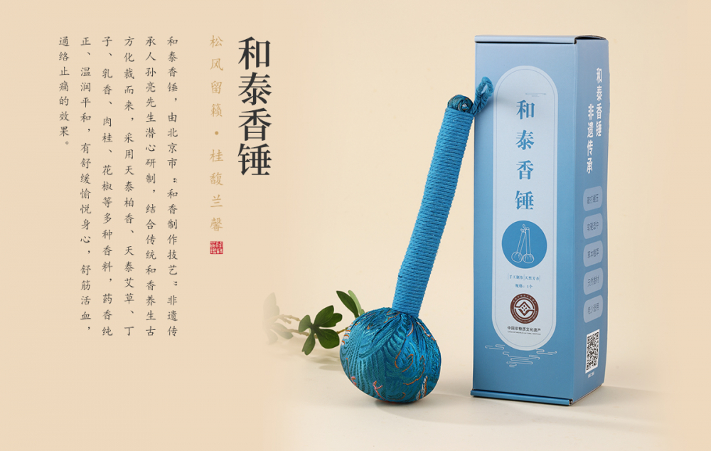 和泰香锤,由北京市“和香制作技艺”非遗传承人孙亮先生潜心研制,结合传统和香养生古方化裁而来,采用天泰柏香、天泰艾草、丁子、乳香、肉桂、花椒等多种香料,药香纯正、温润平和,有舒缓愉悦身心,舒筋活血,通络止痛的效果。