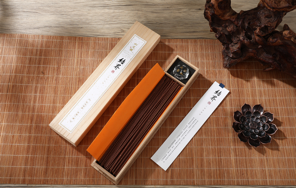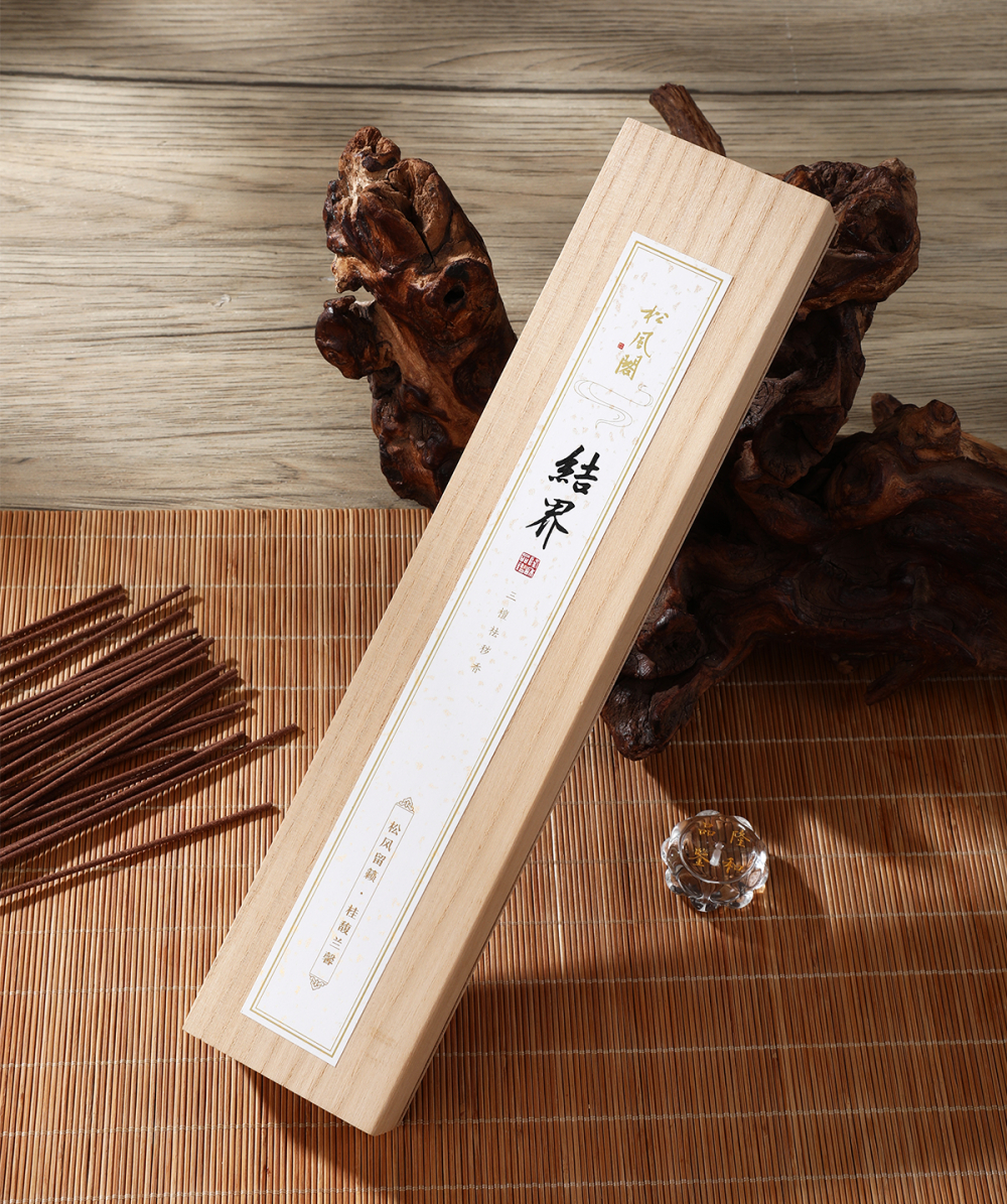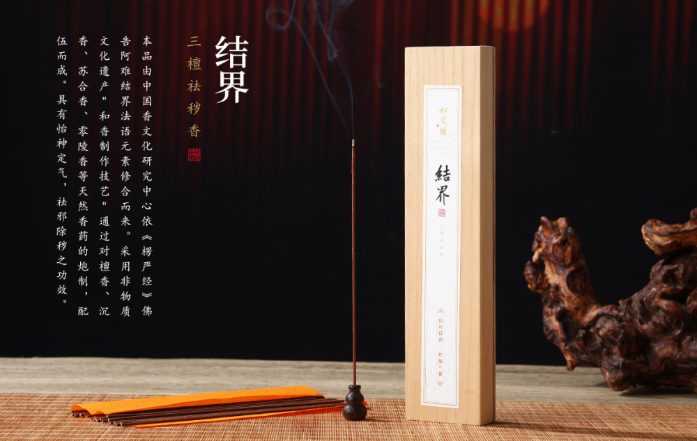 本品由中国香文化研究中心依《楞严经》佛告阿难结界法语元素修合而来。采用非物质文化遗产"和香制作技艺"通过对檀香、沉香、苏合香、零陵香等天然香药的炮制,配伍而成。具有怡神定气,祛邪除秽之功效。
