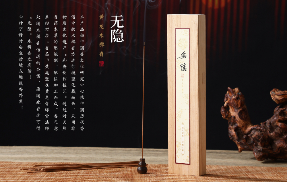 本产品由中国香文化研究中心依中国历代香谱中的木樨香方进行梳理化裁而来。采用非物质文化遗产“和香制作技艺”通过对天然香药本草的配炮制,配伍加工而成。香气意象拟对应“香圣”黄庭坚在黄龙寺晦堂法师处闻木樨香悟道的公案,愿闻此香者可得“无隐”木樨香之真谛!